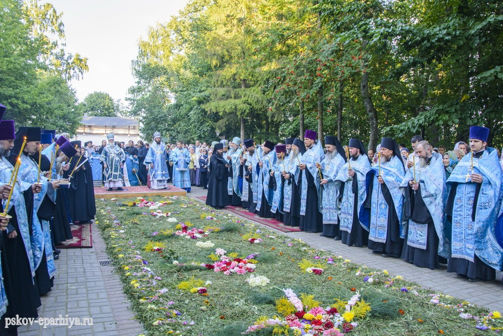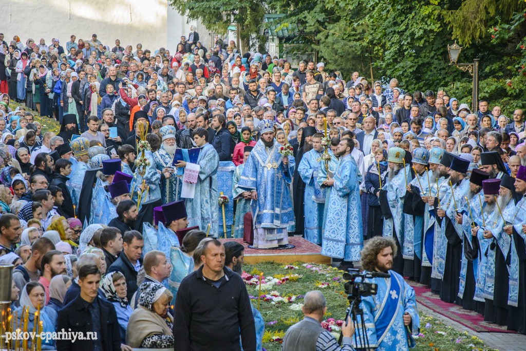 За богослужением молились настоятельницы Спасо-Казанского, Спасо-Елеазаровского и Снетогорского женских монастырей с сестрами и многочисленные паломники, собравшиеся в этот день в святую обитель почтить Пресвятую Богородицу.