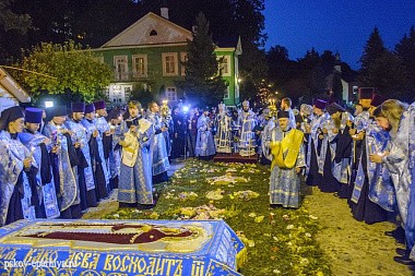 После великого славословия состоялся многочисленный крестный ход с Плащаницей с изображением Успения Пресвятой Богородицы от Михайловского собора к Успенскому храму Псково-Печерской обители.