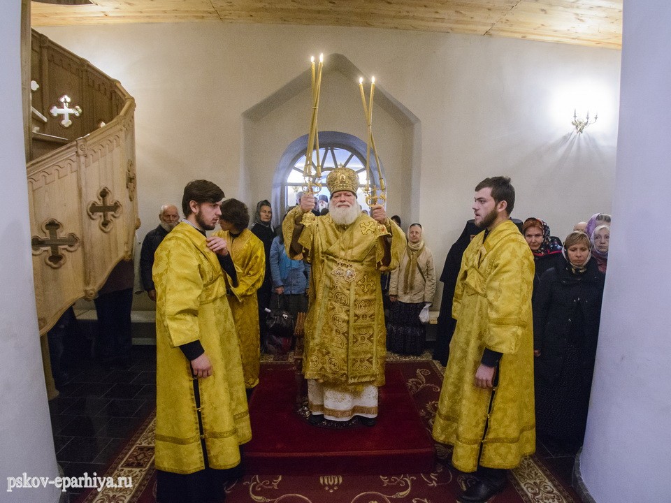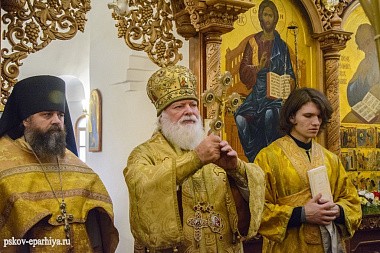 Его Высокопреосвященству сослужили наместник обители игумен Савва (Комаров) с братией в священном сане, наместник Свято-Благовещенской Никандровой пустыни архимандрит Спиридон (Иващенко), старейший клирик митрополии – почетный настоятель храма Святой великомученицы Варвары г. Печоры протоиерей Евгений Пелешев и духовенство митрополии.