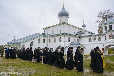 За богослужением молились настоятельница Спасо-Казанского монастыря г. Острова игумения Маркелла (Павлова), настоятельница Рождества Богородицы женского монастыря г. Пскова игумения Татиана (Пашкова), настоятельница Спасо-Елеазаровской обители игумения Евфросиния (Головнева), настоятельница Свято-Никольского монастыря г. Могилева игумения Евфросиния (Сидорович) с сестрами обителей и многочисленные паломники.