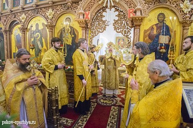 По окончании Литургии состоялся праздничный молебен, в завершение которого Псковский архипастырь прочел молитву святому апостолу Иоанну Богослову, испрашивая его заступления и молитвенного предстательства перед Престолом Божиим за всех молящихся. Затем были пропеты праздничные величания и провозглашены традиционные многолетия.