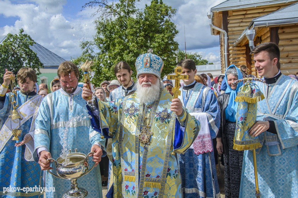 Его Высокопреосвященству сослужили наместник Свято-Благовещенской Никандровой пустыни архимандрит Спиридон (Иващенко), наместник Иоанно-Богословского Савво-Крыпецкого монастыря игумен Савва (Комаров), благочинный Островского округа священник Роман Павлов и духовенство митрополии.