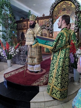 За Божественной литургией Его Высокопреосвященству сослужили игумен обители игумен Гавриил (Куликов) и братия монастыря в священном сане.