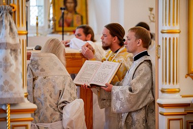Церковные песнопения исполнил архиерейский мужской хор под управлением Дениса Рогова.