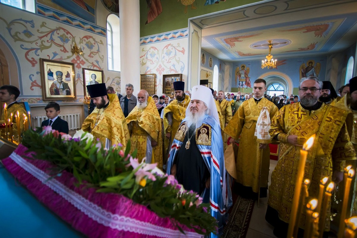 За Литургией Его Высокопреосвященству сослужили наместник Казанско-Богородицкого мужского монастыря г. Казани игумен Марк (Виленский), благочинный Елабужского округа Казанской епархии протоиерей Михаил Гречко, благочинный Закамского округа протоиерей Андрей Дубровин, благочинный Нижнекамского округа Чистопольской епархии протоиерей Александр Колчерин, настоятель Успенского храма города Казани протоиерей Алексий Краевский, настоятель Покровского собора г. Елабуги иерей Симеон Лепихин, настоятель храма Трех святителей с. Ижевка (Менделеевский район) иерей Владимир Тимофеев, священники Елабужского монастыря Илия Кривов, Даниил Кривов и Илия Павлов.