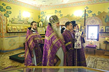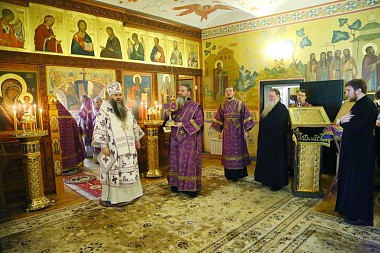 Правящему архиерею сослужили настоятель обители архимандрит Тихон (Затёкин) и другие клирики Нижегородской епархии.