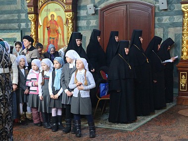 За богослужением вместе с многочисленными прихожанами молились настоятельница Свято-Троицкого Серафимо-Дивеевского монастыря игумения Сергия (Конкова), настоятельница Крестовоздвиженского монастыря Нижнего Новгорода игумения Филарета (Гажу), настоятельница Арзамасского Свято-Николаевского монастыря игумения Филарета (Шевченко), настоятельница Покровского монастыря в с. Лукине Богородского района игумения Гавриила (Суханова), настоятельница архиерейского подворья Арзамасского Новодевичьего Алексия, человека Божия, монастыря монахиня Феогноста (Гончарова), настоятельница архиерейского подворья Мало-Пицкого Всехскорбященского монастыря инокиня Филарета (Андрейко), настоятельница нижегородского архиерейского подворья храма в честь Святых Кирилла и Мефодия инокиня Алипия (Андрейко), а также учащиеся Саровской православной гимназии имени преподобного Серафима Саровского и их родители.