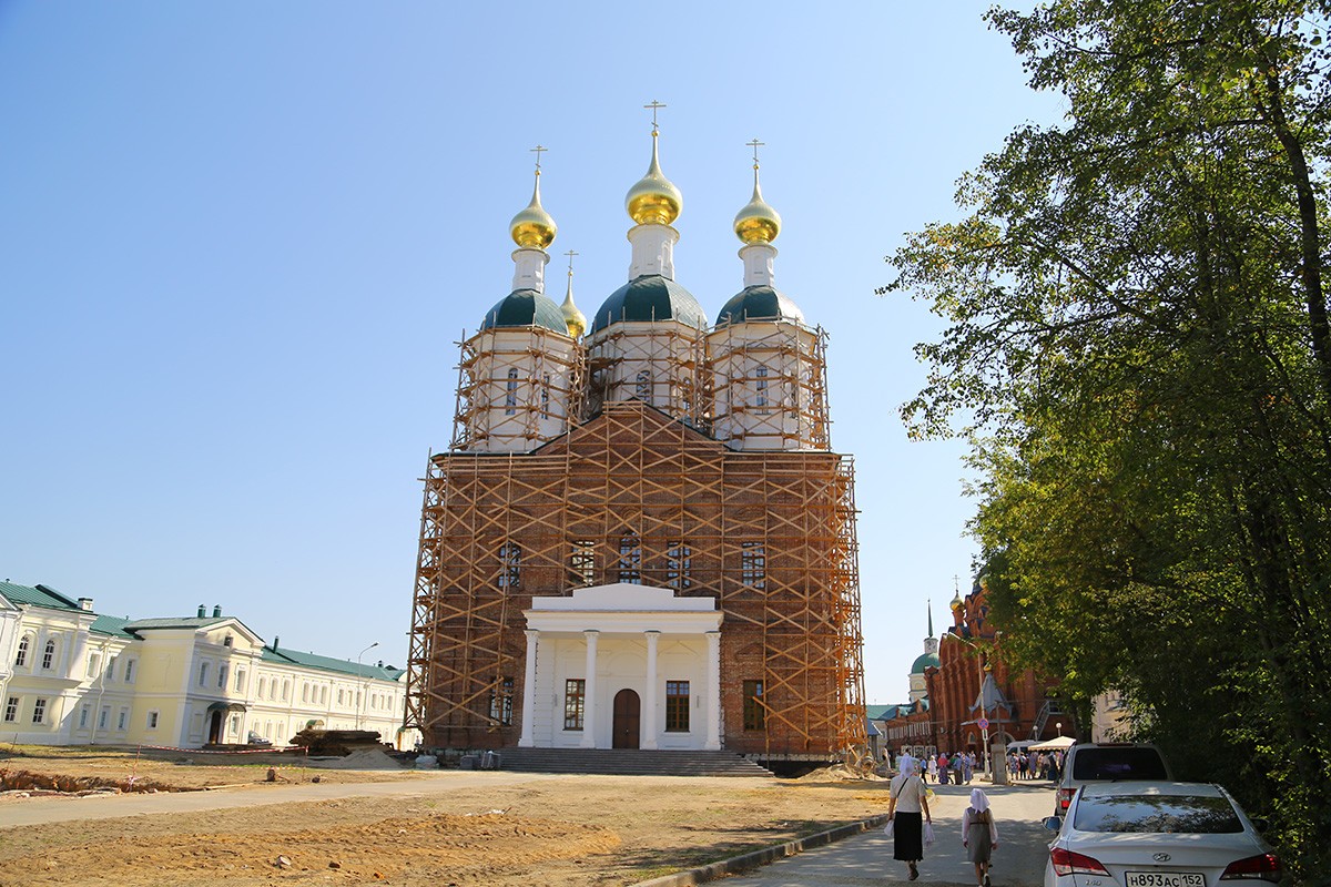 Весной 2016 года началось восстановление Успенского собора. Проект воссоздания главного храма Саровской пустыни выполнен ООО «Региональный инженерный центр». При разработке учтены все особенности грунтового основания, связанные с высокой карстоопасностью площадки строительства, близостью расположения пещерного храма и промышленной сейсмикой. Грандиозный 60-метровый собор был заложен 1 августа 2016 года Патриархом Московским и всея Руси Кириллом. Недавно его увенчали золотые купола. Иконописцы нижегородской мастерской «Ковчег» под руководством Алексея Анциферова расписали в классическом стиле алтарную часть храма.