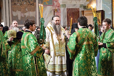 Правящему архиерею сослужили благочинный Саровского округа протоиерей Александр Долбунов, настоятель нижегородского храма во имя Пресвятой Живоначальной Троицы протоиерей Сергий Шалатонов и другие клирики Нижегородской епархии.