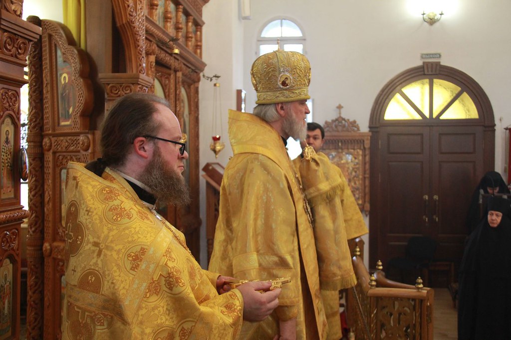 Его Высокопреосвященству сослужили наместник Курской Коренной Рождества Пресвятой Богородицы мужской пустыни игумен Серафим (Котельников) и клирик монастыря иеромонах Михей (Гориславец).