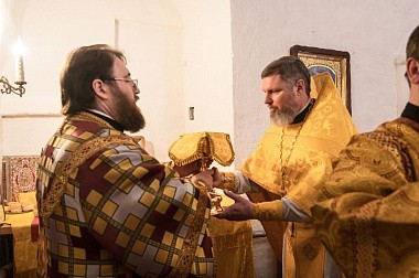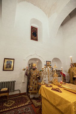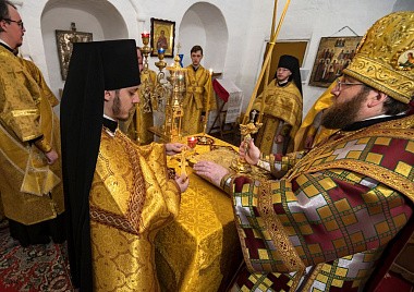 Его Высокопреосвященству сослужили и.о. наместника Спасо-Прилуцкого монастыря иеромонах Александр (Чеборов), руководитель Службы протокола иерей Алексей Булеков, келарь монастыря иеромонах Ферапонт (Широков), заведующий канцелярией монастыря иеромонах Алексий (Скворцов), клирики Вологодской епархии.