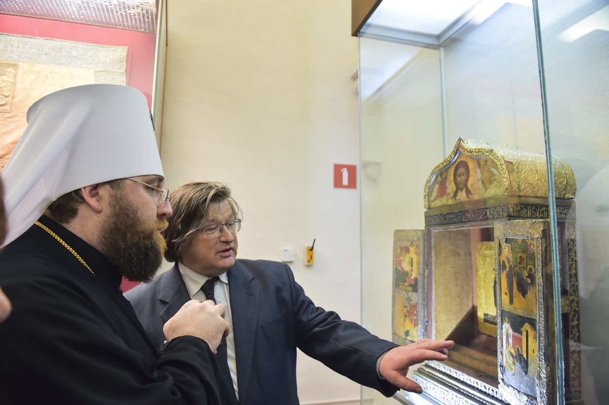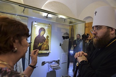 Затем в Трапезной палате музея глава Вологодской митрополии митрополит Вологодский и Кирилловский Игнатий принял участие в открытии экспозиции двух икон: образа преподобного Кирилла, написанного при жизни святого его учеником прп. Дионисием Глушицким, а также иконы «Богоматерь Одигитрия» конца XIV века, которую по преданию принес из Москвы на Русский Север сам прп. Кирилл Белозерский.