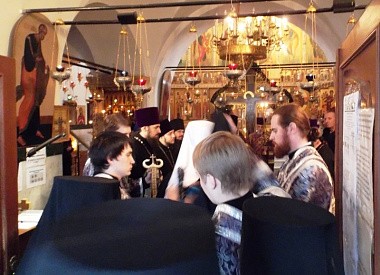 Священнослужители соборно прочли акафист Страстям Христовым, а затем Евангелие на эту же тему.
