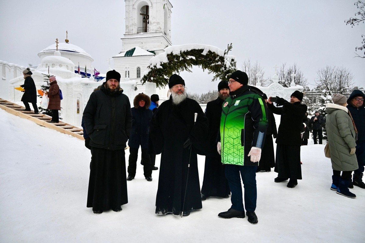 Архиерей посетил ледяную пещеру, осмотрел снежный храм, скульптуру архангела, ледяную миниатюру Раифского монастыря, Рождественский вертеп и другие фигуры, отражающие евангельскую историю и символизирующие рождение Спасителя.