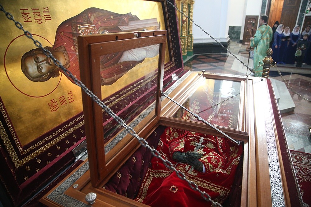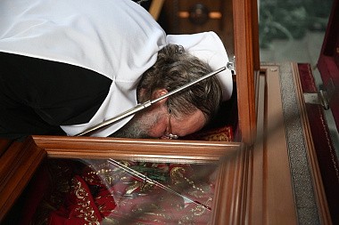 Затем духовенство вместе с паствой поклонились мощам святого мученика священника Константина Богоявленского в храме Архангела Михаила.