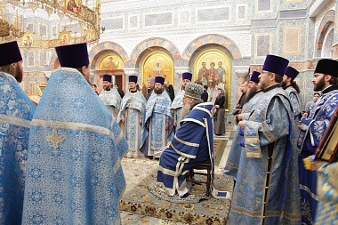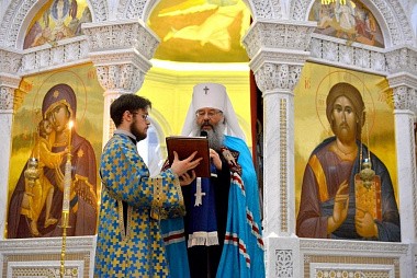 Митрополит Кирилл обратился к участникам богослужения и зачитал Патриаршее послание Преосвященным архипастырям, священнослужителям, монашествующим и мирянам епархий на территории России.