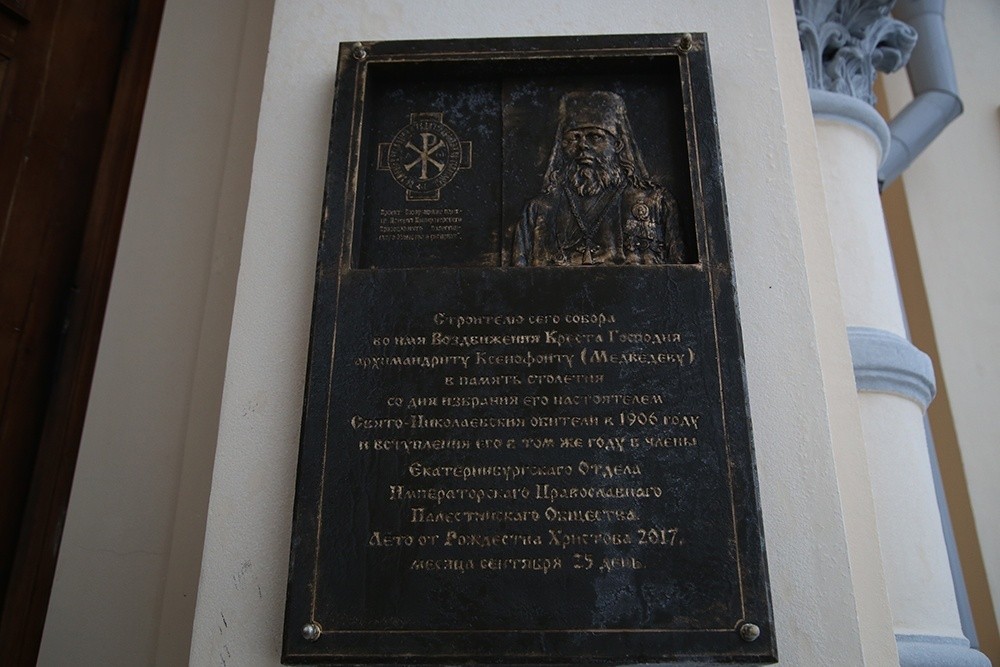 «Освящается памятная доска строителя сего собора во имя Воздвижения Креста Господня архимандрита Ксенофонта (Медведева) в память столетия со дня избрания его настоятелем Свято-Николаевской обители в 1906 году и вступления его в том же году в члены Екатеринбургского отделения Императорского православного палестинского общества в лето от Рождества Христова 2017 месяца декабря 31 (18) дня», – гласит надпись на памятной доске.