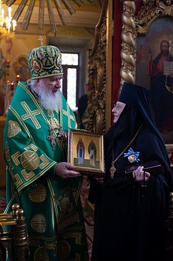 Председатель Законодательного Собрания Калужской области В.С. Бабурин передал игумении Феофиле поздравления губернатора Калужской области А.Д. Артамонова и вручил медаль Калужской области.
