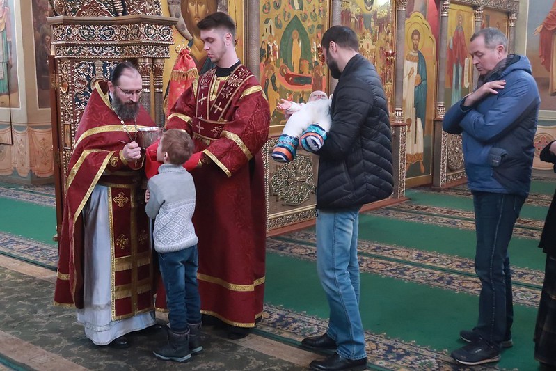 Богослужение сопровождалось пением мужского хора Новгородского духовного училища и всех молящихся в храме под управлением регента диакона Андрея Каурова.