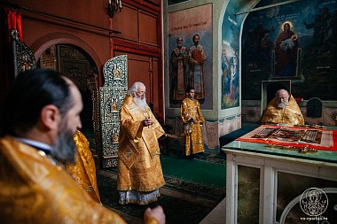 Его Высокопреосвященству сослужили и. о. наместника монастыря иеромонах Антоний (Битьмаев), насельники обители – иеромонахи Евсевий (Голубев), Борис (Григорьев) и Пантелеимон (Шахтахтинский) и клирик Троицкого храма г. Валдая протоиерей Иоанн Протазанов.