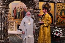Его Высокопреосвященству сослужили и.о. наместника монастыря иеромонах Антоний (Битьмаев), насельники обители иеромонахи Борис (Григорьев) и Пантелеимон (Шахтахтинский), клирик Софийского собора иерей Николай Полозов.