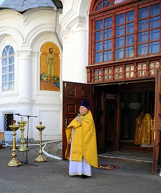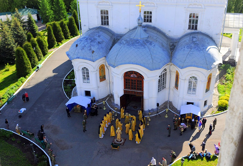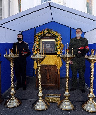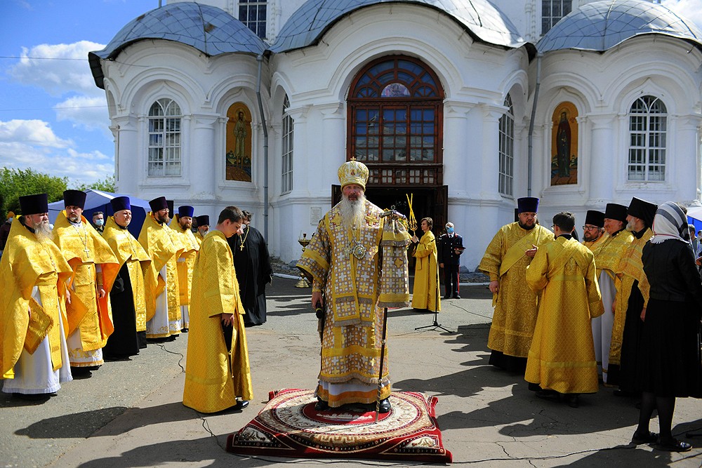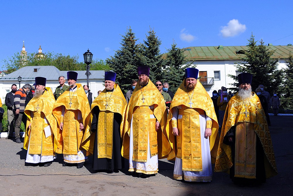 В связи с пандемией богослужение совершалось на площади перед Успенским собором монастыря с учетом всех рекомендаций Роспотребнадзора.