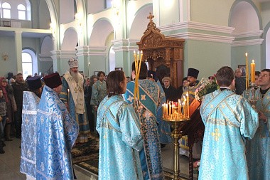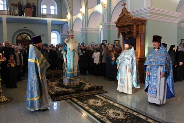 Его Высокопреосвященству сослужили секретарь Вятской епархии иерей Виталий Лапшин, благочинный Слободского благочиния протоиерей Евгений Смирнов, клирики Христорождественского женского монастыря протоиереи Игорь Павлов и Николай Бутюгов, настоятель Екатерининского собора и храма в честь иконы Божией Матери «В скорбех и печалех Утешение» г. Слободского протоиерей Сергий Пентин.
