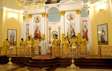 Его Высокопреосвященству сослужили секретарь Вятской епархии иерей Виталий Лапшин, наместник Великорецкого подворья Трифонова монастыря архимандрит Феодор (Рулев), благочинный Свято-Трифонова монастыря игумен Вениамин (Веселов), настоятель Пантелеимоновского храма протоиерей Сергий Ендальцев, клирик подворья Свято-Успенского Трифонова монастыря с. Великорецкого иеромонах Николай (Белев).