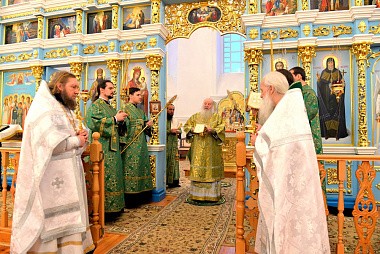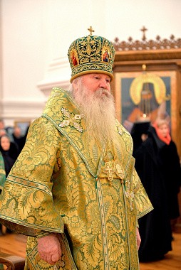 Главе Липецкой митрополии сослужили благочинный Задонского Рождество-Богородицкого мужского монастыря архимандрит Трифон (Голубых) и духовенство Богородице-Тихоновского монастыря.