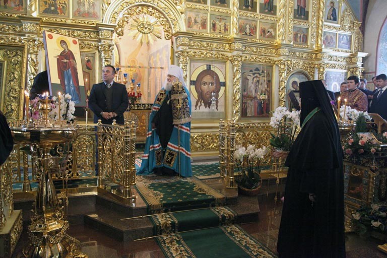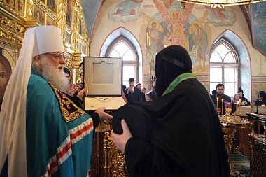 По окончании Божественной литургии митрополит Пантелеимон огласил приветственный адрес игумении Варваре от Святейшего Патриарха Московского и всея Руси Кирилла и вручил ей орден преподобного Сергия Радонежского II степени.