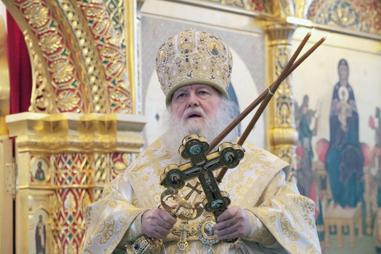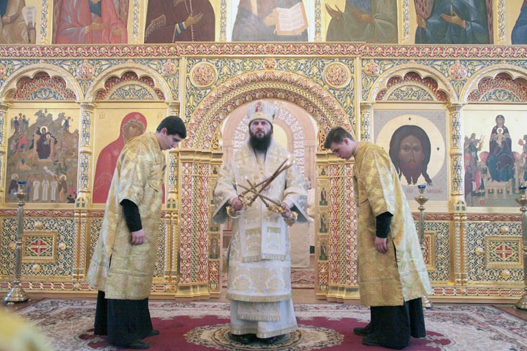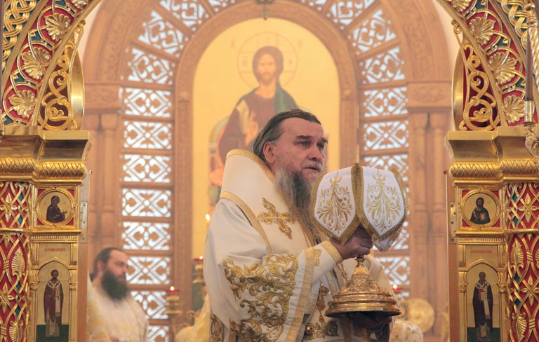 По окончании Божественной литургии епископ Феодор поприветствовал митрополита Пантелеимона: