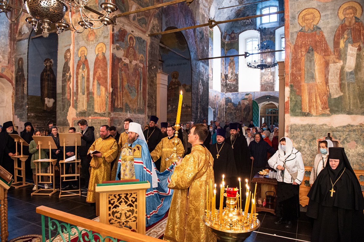 Его Высокопреосвященству сослужили наместник монастыря игумен Анастасий (Додарчук), благочинный монастырей игумен Иоасаф (Вишняков), благочинный Кирилловского округа протоиерей Владимир Колосов, братия обители в священном сане и клирики Вологодской епархии.