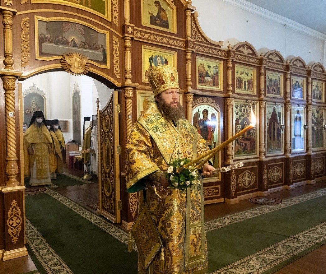 После сугубой ектении архиерей вознес молитву об избавлении от вредоносного поветрия. Митрополит Вологодский и Кирилловский помянул имена из записок, присланных ему верующими в соцсетях и на сайт епархии.