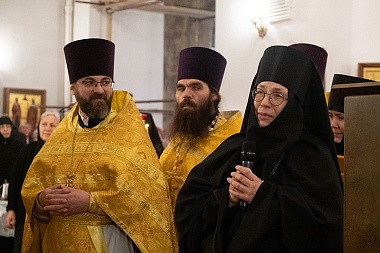 По окончании богослужения от лица прихожан со словами благодарности к Его Высокопреосвященству обратилась настоятельница монастыря игумения Лариса (Лобанова).