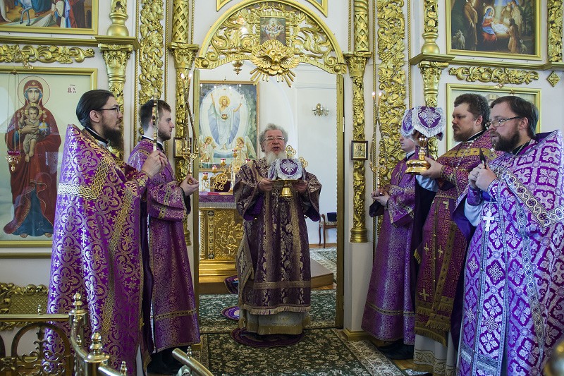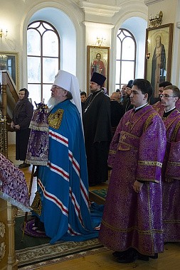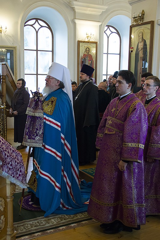 В совершении Божественной литургии по чину святителя Василия Великого Его Высокопреосвященству сослужили секретарь Воронежского епархиального управления протоиерей Андрей Скакалин, благочинный Монастырского церковного округа иеромонах Алексий (Сукачев) и клирик Преображенского храма монастыря священник Дионисий Агапов.