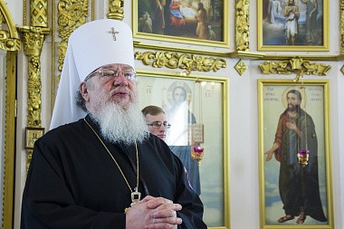 У входа в Преображенский собор обители архипастыря встречали настоятельница Толшевского Спасо-Преображенского женского монастыря игумения Варвара (Сажнева) с сестрами.