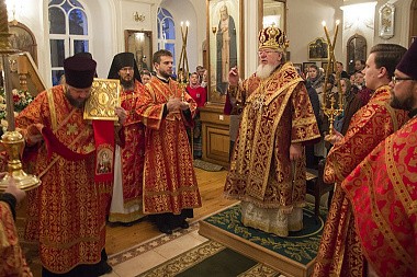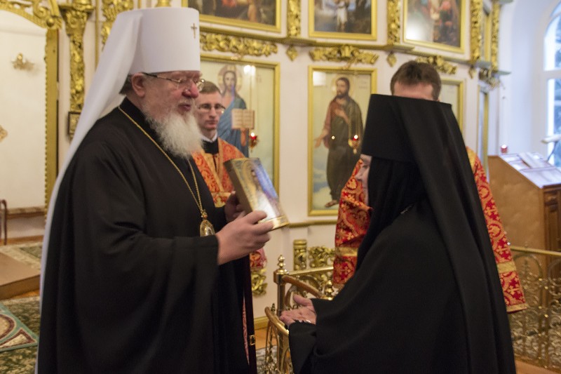По завершении проповеди Его Высокопреосвященство поздравил настоятельницу обители игумению Варвару с днем тезоименитства и вручил в дар икону Христа Спасителя.