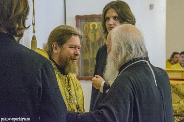 Его Высокопреосвященству сослужили наместник Свято-Благовещенской Никандровой пустыни архимандрит Спиридон (Иващенко), наместник Иоано-Богословского Савво-Крыпецкого монастыря игумен Савва (Комаров), наместник Спасо-Преображенского Мирожского монастыря иеромонах Серафим (Козулин), а также местное духовенство.