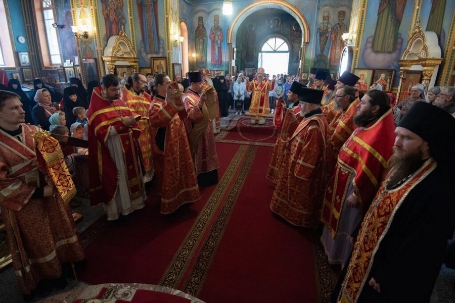 Его Высокопреосвященству сослужили секретарь Томской епархии архимандрит Иосиф (Еременко), секретарь Колпашевской епархии иеромонах Симеон (Койнов), клирики Свято-Никольской обители и насельники Спасо-Преображенского мужского монастыря с. Волок в священном сане.