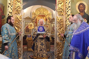 Затем наместник монастыря поздравил главу Чувашской митрополии с праздником и преподнес священноархимандриту обители заздравную просфору и букет цветов.