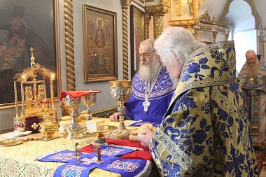 Его Высокопреосвященству сослужили наместник святой обители архимандрит Василий (Паскье), настоятели подворий монастыря игумен Мануил (Шитов) и иеромонах Тарасий (Гурьев) и братия святой обители в священном сане.