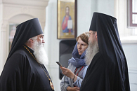 Его Высокопреосвященству сослужили митрополит Астраханский и Камызякский Никон, епископы Тихвинский и Лодейнопольский Мстислав, Солнечногорский Алексий, Петергофский Силуан, клирики монастыря и другие священнослужители.
