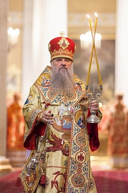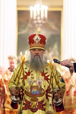По завершении молебна митрополит Варсонофий зачитал поздравление Святейшего Патриарха Московского и всея Руси Кирилла владыке Назарию по случаю дня тезоименитства и 65-летия со дня рождения: