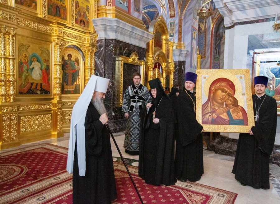 В завершение игумения София поблагодарила правящего архиерея за совместную молитву в покаянные дни Великого поста и преподнесла Высокопреосвященнейшему владыке Корсунскую икону Божией Матери.