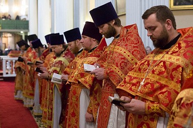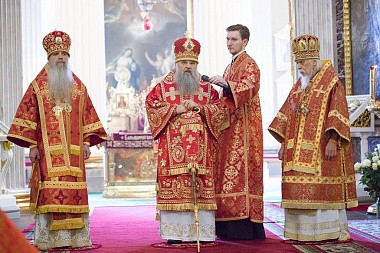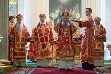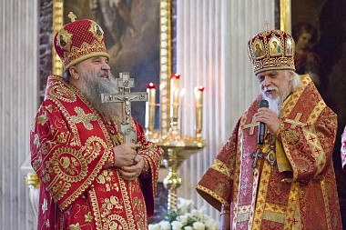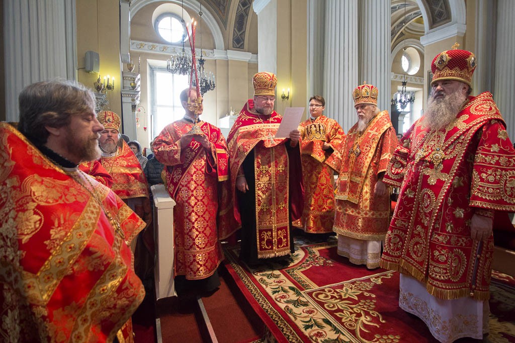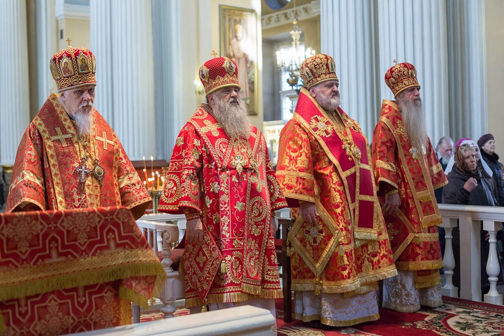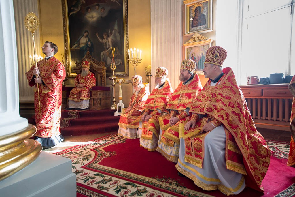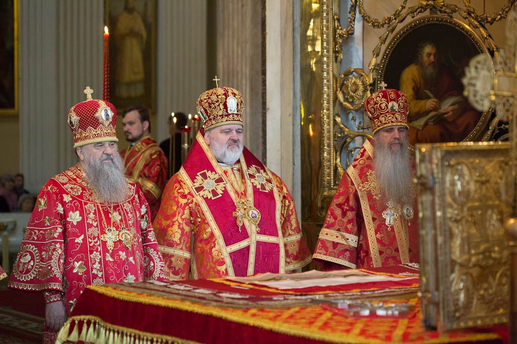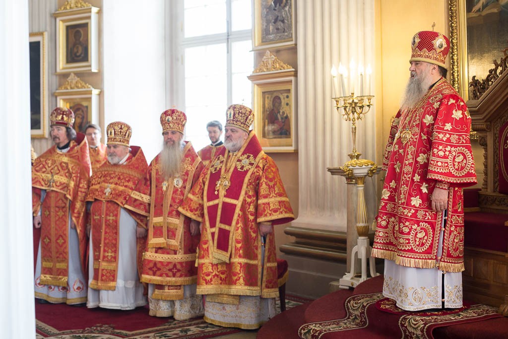 Его Высокопреосвященству сослужили наместник лавры епископ Кронштадтский Назарий, епископ Каменский и Алапаевский Мефодий, епископ Орехово-Зуевский Пантелеимон, настоятель Староладожского Никольского монастыря Тихвинской епархии игумен Варфоломей (Чупов) и секретарь епархиального управления протоиерей Сергий Куксевич и другие священнослужители.