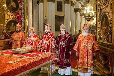 Его Высокопреосвященству сослужили архиепископ Петергофский Амвросий, епископы Царскосельский Маркелл, наместник Лавры епископ Кронштадтский Назарий с клиром, Тихвинский и Лодейнопольский Мстислав, Гатчинский и Лужский Митрофан, а также секретарь епархиального управления протоиерей Сергий Куксевич, благочинные, настоятели храмов.