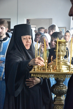 По окончании Литургии владыка Вениамин вручил игумении Иоанне игуменский посох, который служит знаком власти над подчиненными и законного управления ими.