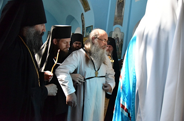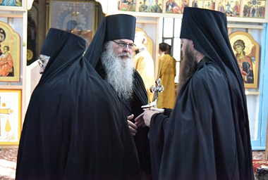 Его Высокопреосвященство постриг послушника монастыря инока Онисима (Симонова) в мантию с наречением именеми Мисаил в честь священномученика Мисаила Рязанского.