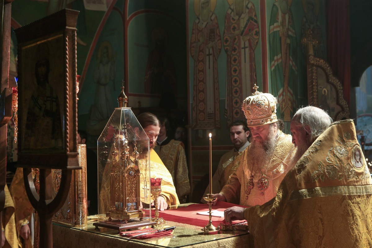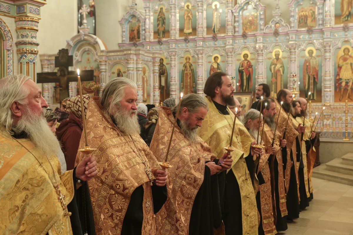 Богослужебные песнопения исполнили митрополичий хор (регент Константин Михайлов) и хор Иоанно-Богословского мужского монастыря под управлением монаха Прохора (Пожарницкого).