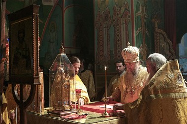 По заамвонной молитве состоялось славление праздника перед иконой святого апостола и евангелиста Иоанна Богослова. Владыка Вениамин прочел молитву святому угоднику.